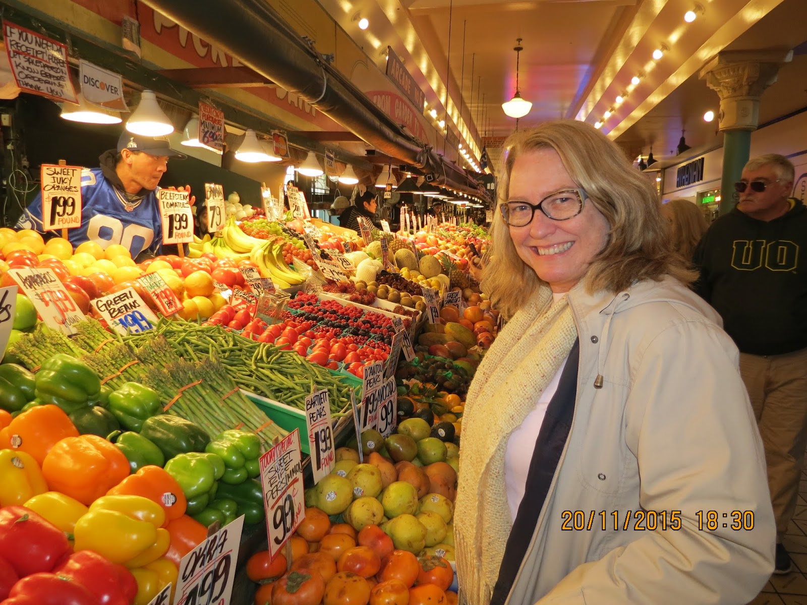 Fomos conhecer o Mercado Público - Pike Market, onde os agricultores expõem seus produtos: frutas, verduras, legumes, peixes, carnes, artesanato - de forma bem semelhante ao Mercado Público de Porto Alegre.